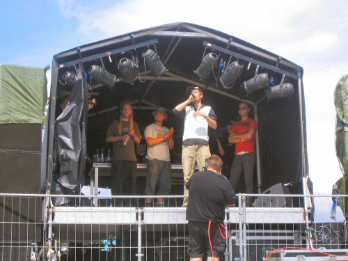 Vi var rykket i felten til den første store hiphop-dag på årets Roskilde, hvor det hurtigt skulle vise sig humøret stod ligeså højt som mudderet på Dyrskuepladsen.